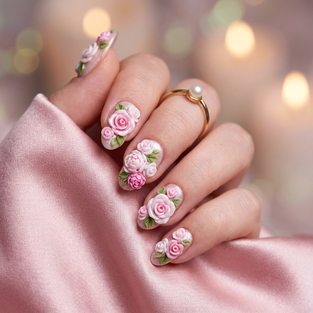 Delicate roses, peonies, and cherry blossoms literally bloom from your nails with our 3D floral sculptures. Each petal is individually crafted using acrylic or hard gel, requiring steady hands and an artist's eye for proportion. These botanical masterpieces transform your nails into miniature gardens of unparalleled beauty.