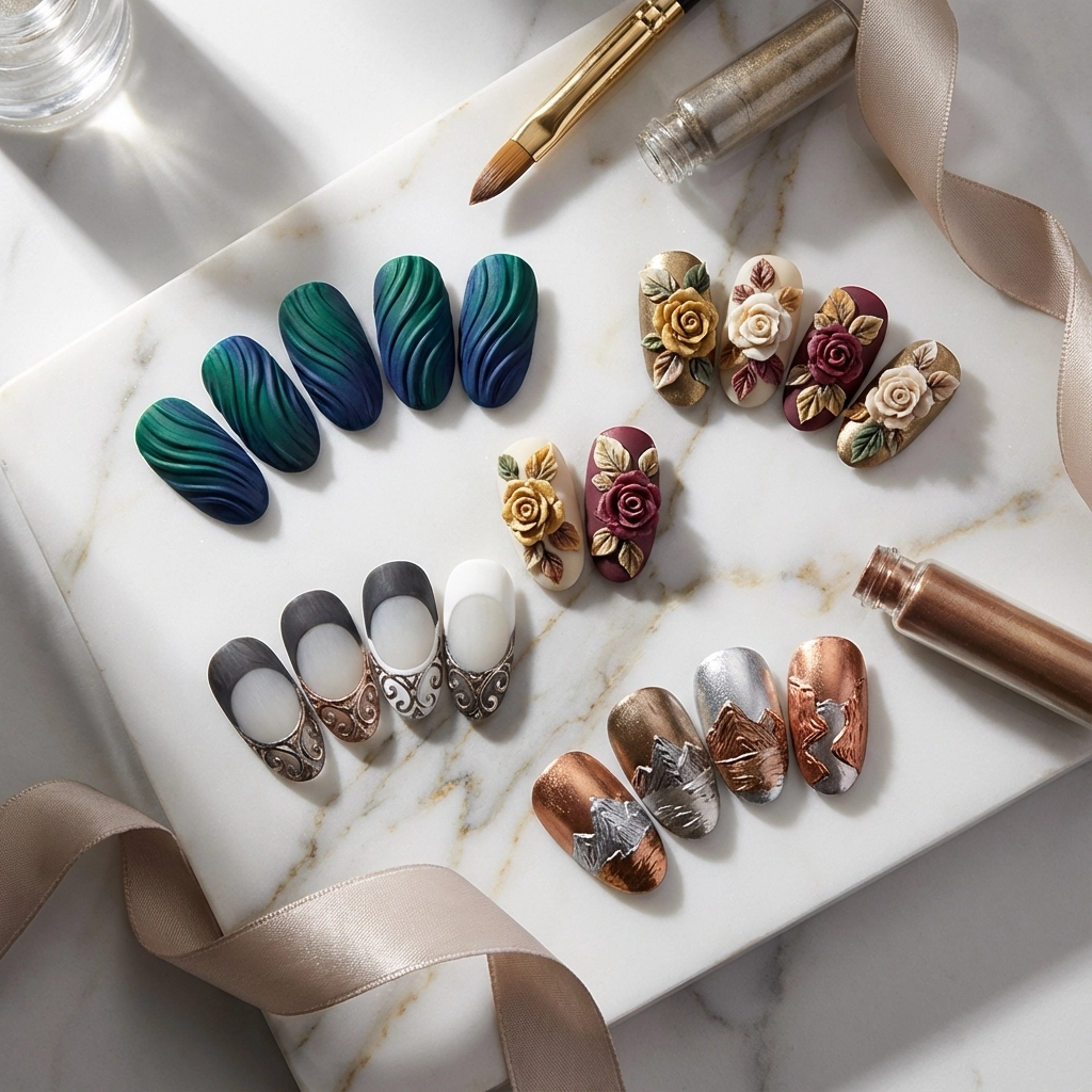 Metallic Carved Landscapes: Intricate carved designs filled with metallic pigments create varying depths across the nail surface. Japanese gel's flexibility prevents cracking at transition points.