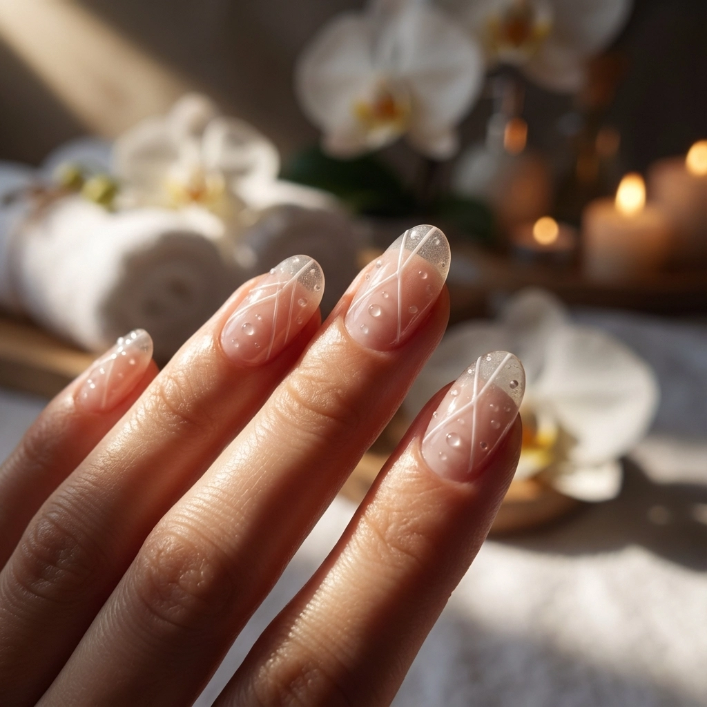 Think delicate gel-stitched lines that catch light like silk threads, translucent pearl dots that seem to float beneath the surface, and subtle raised accents that you feel before you see them. These micro-details create an almost holographic effect that shifts and changes as light moves across the nail.