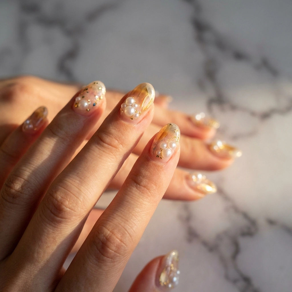 Layer multiple shades of opalescent Japanese gel with embedded micro-pearls, creating a dreamy waterfall effect that shifts color with every movement. This design captures light beautifully while maintaining sophisticated appeal.
