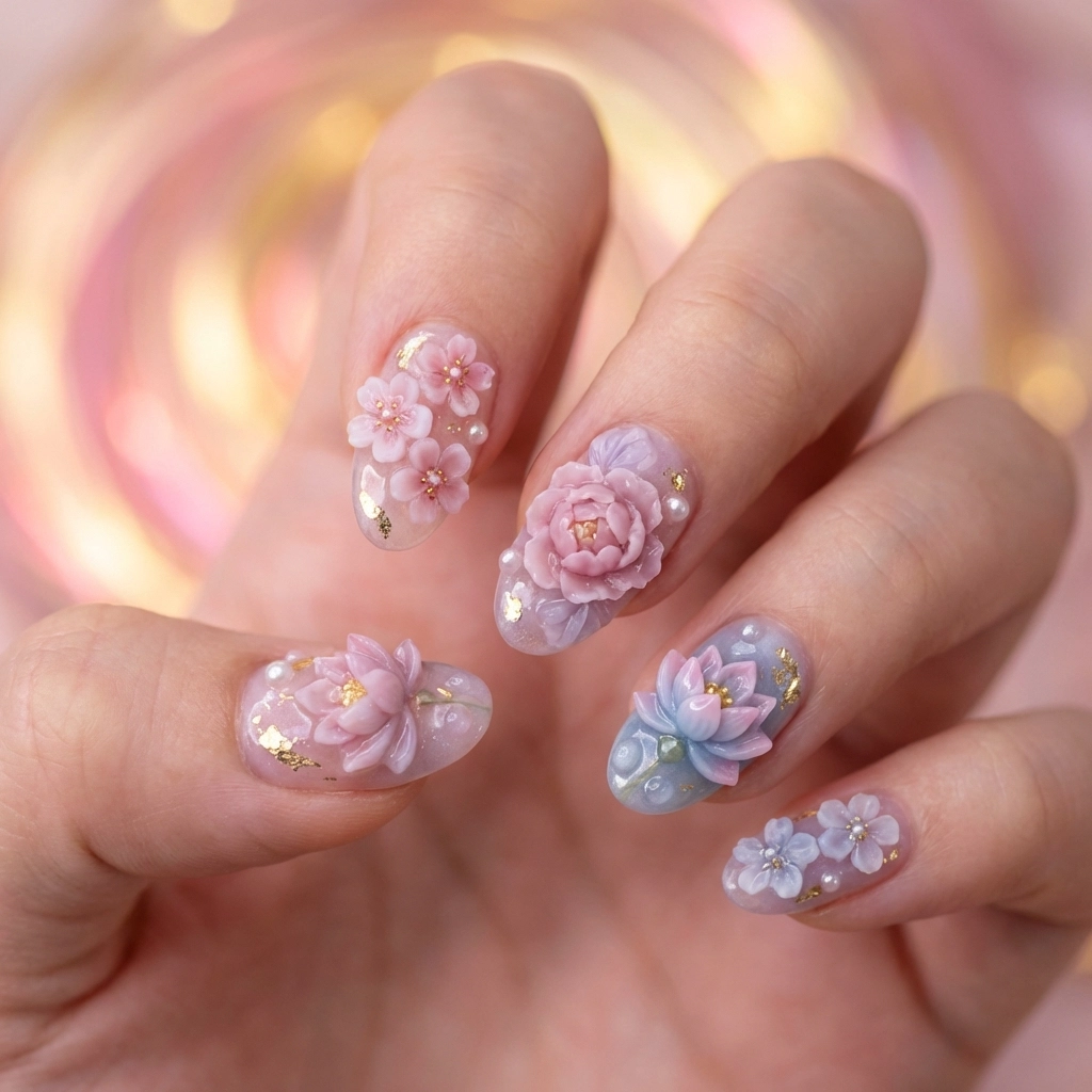 Hand-sculpted 3D roses in soft pastels with gold accents create a romantic maximalist statement. Each rose is crafted with Japanese gel's superior workability, ensuring longevity and refined detail.