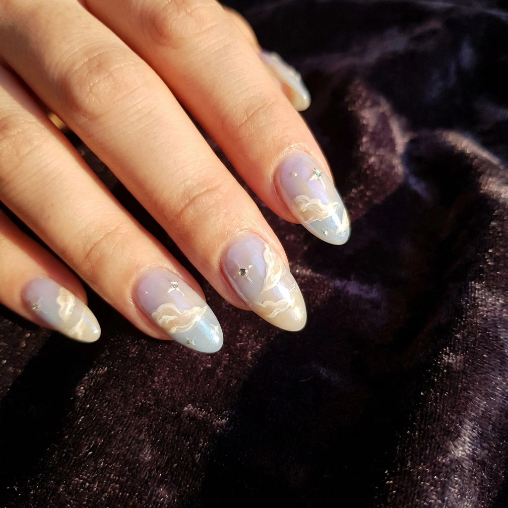 This mesmerizing design combines soft pearl bases with hand-painted cloud formations in iridescent whites and champagne tones. The Japanese gel's three-star opacity system creates depth that seems to float above the nail bed, giving clients an otherworldly elegance perfect for Norwood's sophisticated social scene.