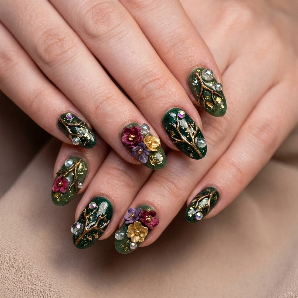 The ultimate expression of refined maximalism, this design features dimensional florals, micro-branches, and crystal dewdrops. Japanese gel's strength allows for substantial 3D elements without compromising wearability – perfect for special events and celebrations.